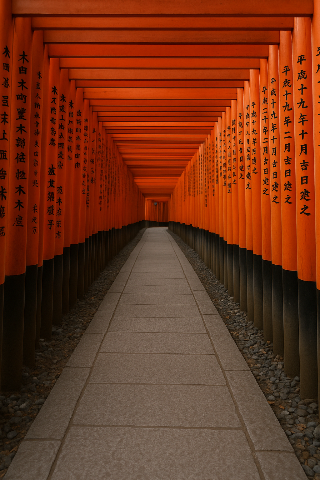 붉은 도리이 사이에서 찍는 사진은 인생샷으로 유명합니다. 사람이 적은 시간대를 노려야 영화 같은 장면을 담을 수 있습니다.