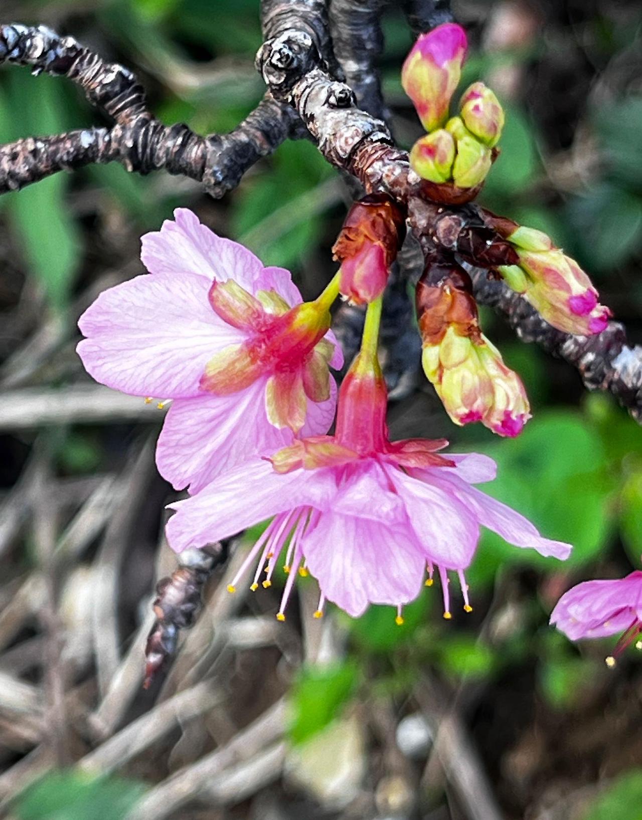 오키나와의 벚꽃은 일본 본토와 다른 칸히자쿠라 품종으로 색이 진한 분홍색이며 아래로 향해 피는 특징이 있습니다.