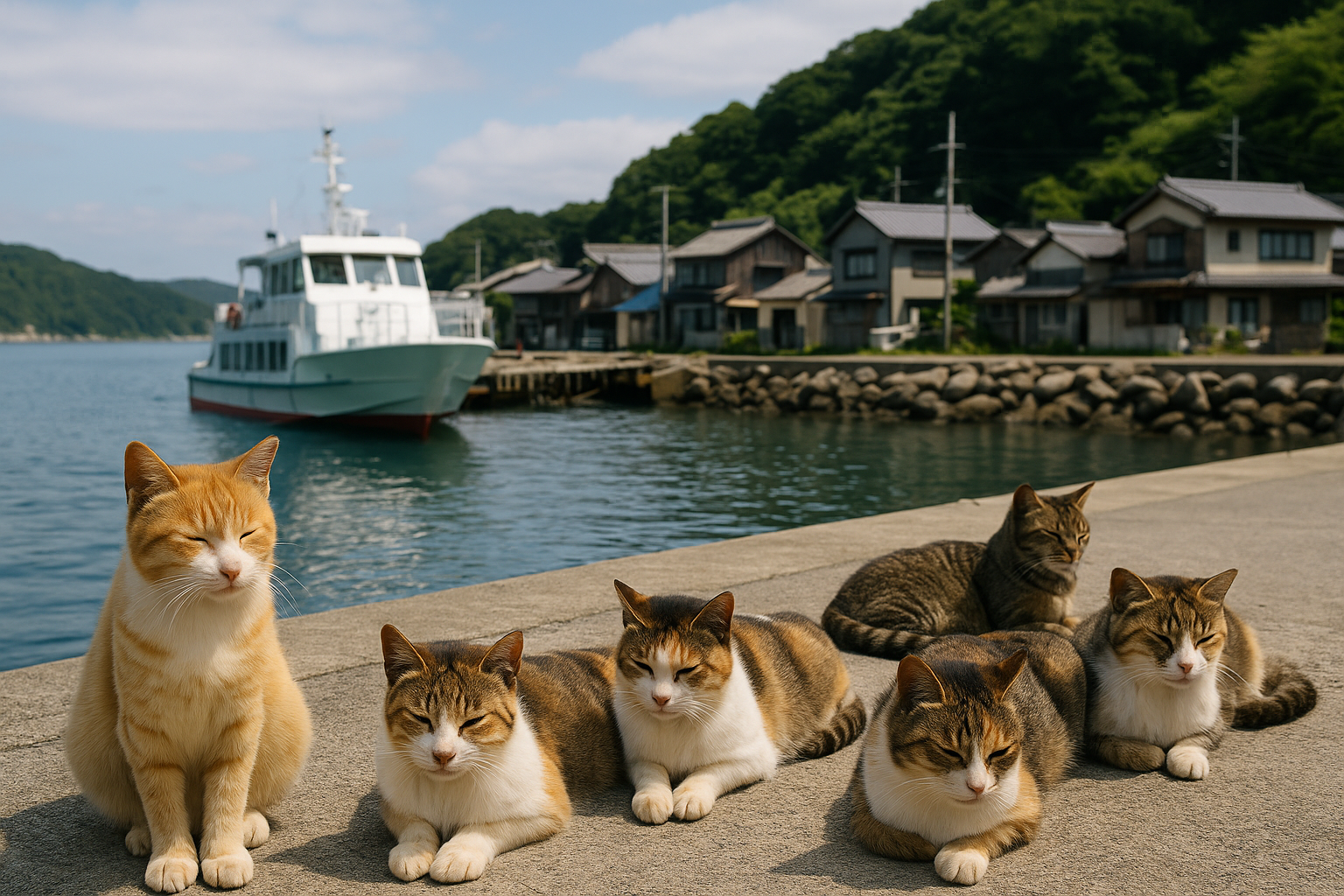 평화로운 어촌과 자유롭게 돌아다니는 고양이들,