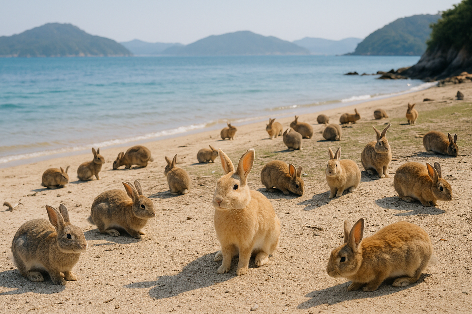 오쿠노시마의 하루는 바다, 햇살, 그리고 수많은 토끼들로 시작됩니다.