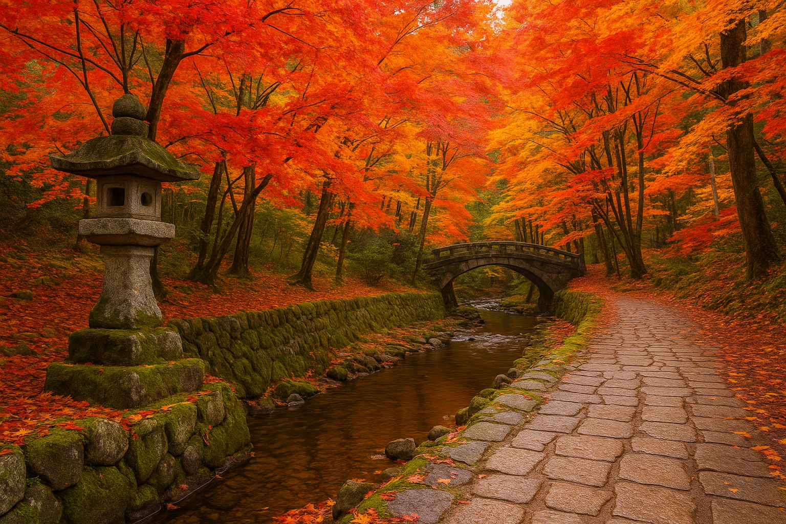 - 고시카이도 옛길의 돌다리와 숲길 구간 → 전통과 단풍이 어우러진 장면