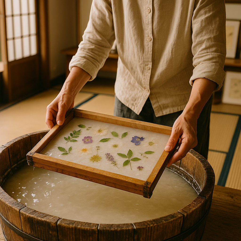 - 대야에서 종이 뜨기 – 평평하게 펴고 흔들어 결 고르기