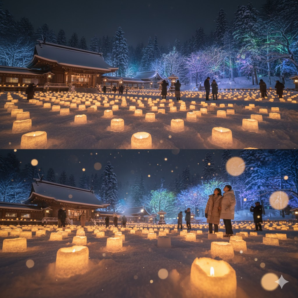 이 행사의 가장 큰 매력은 인위적인 전기 조명보다는 **약 1,000개의 눈 촛불(Snow Candles)**이 만들어내는 아날로그적인 감성입니다. 온천 마을 주민들이 직접 정성껏 만든 눈 등불이 조잔케이 신사를 가득 메우며, 눈부시게 하얀 설경 위에 일렁이는 촛불은 마치 동화 속 한 장면 같은 몽환적인 분위기를 자아냅니다.